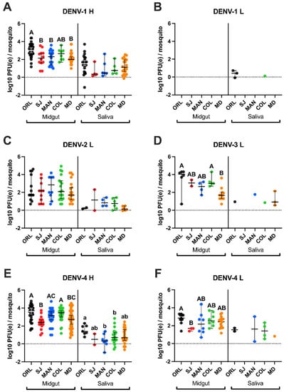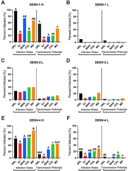 All statistical analyses were performed with SPSS statistical software (IBM Corp. Released 2020. IBM SPSS Statistics for Windows, Version 27.0. Armonk, NY, USA: IBM Corp, accessed 2 September 2021). Figures were created using GraphPad Prism Version 9.1.1 (223), for Mac, GraphPad Software, San Diego, CA, USA, www.graphpad.com (accessed on 2 September 2021) or Microsoft Powerpoint Version 16.53 for Mac. Data for ORL and COL exposed to DENV-4 H and DENV-4 L were reanalyzed from Stephenson et al., 2021 to provide a complete analysis and comparison between all virus groups and mosquito populations [17]. In all tables and figures, numbers/bars/scatter plots bearing at least one of the same alphabetical letters are statistically similar in their values, whereas numbers/bars/scatter plots that do not have an alphabetical letter in common are statistically different. For example, COL had a statistically significant higher transmission potential (11%) for DENV-4 H compared to MD (2%) but was not statistically higher than MAN (4%). Therefore, 11% is denoted with an “A”, 2% is denoted with a “B”, but 4% is denoted with “AB” because this rate was not statistically different from either 11% or 2%.