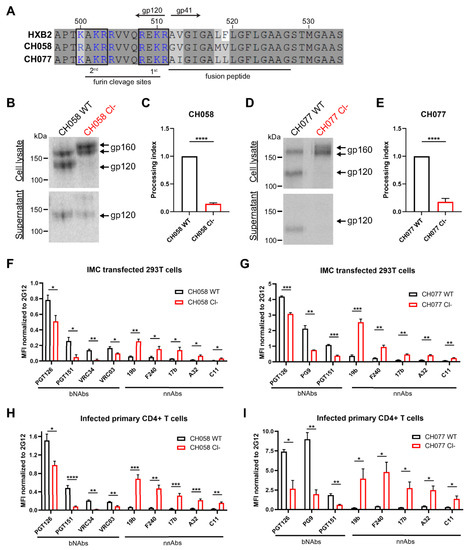 To study the role of the furin cleavage site on Env conformation, we performed mutagenesis on the infectious molecular clones (IMCs) of clade B transmitted/founder (T/F) viruses CH058 and CH077. Envs from both viruses were previously shown to preferentially sample the “closed” State 1 conformation [61]. We introduced substitutions in the primary cleavage site at position 508 and 511 (Figure 1A), to replace the highly conserved arginine residues with serine residues (R508S/R511S; referred as Cl− mutant), a double mutant known to efficiently abrogate furin-dependant Env processing [64,80,81,82]. We used protein radioactive labelling of 293T cells transfected with the different IMC constructs followed by Env immunoprecipitation to confirm the effect of the mutations on Env cleavage (Figure 1B–E). As expected, Env glycoproteins expressed from the wild-type (WT) construct were efficiently cleaved while their cleavage-deficient (Cl−) counterpart yielded little to no detectable gp120 in the 293T whole-cell lysates (Figure 1B,D). Although we observed some soluble gp120 in the supernatant of CH058-transfected cells, this was likely due to the presence of a second upstream cleavage site, which matched the furin consensus sequence (RAKR). The supernatant of CH077-transfected cells did not contain gp120 consistent with an altered upstream cleavage site (KAKR) (Figure 1A). Of note, two bands of gp160 with distinct molecular weights were observed in cells transfected with Cl− variants, a phenotype previously observed that was linked to a difference in Env trafficking and localization [83,84,85].