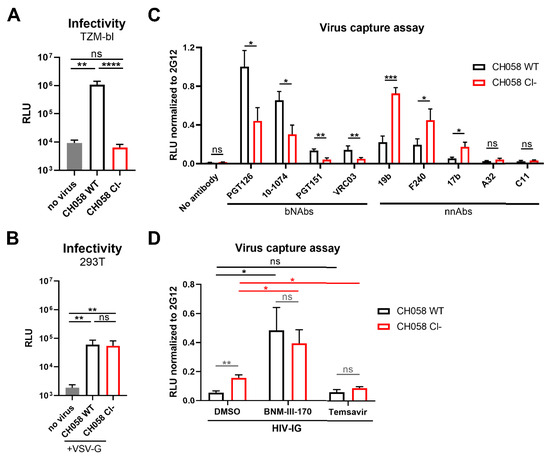 Virions displaying uncleaved Env are better recognized by nnAbs. (A) Viral infectivity was assessed by incubating TZM-bl target cells with HIV-1 CH058 virions expressing the wild-type (WT) or cleavage-deficient (Cl−) Env glycoprotein for 48 h. Viral preparations were normalized according to reverse transcriptase activity. (B) VSV-G-pseudotyped viral particles encoding the luciferase gene (Luc+) and bearing HIV-1 CH058 Env wildtype (WT) or its cleavage-deficient mutant (Cl−) were used to infect 293T cells to determine their infectivity in a single-round infection. (C,D) These recombinant pseudovirions were further tested for virus capture by (C) a panel of anti-Env bNAbs (PGT126, PG9, PGT151, VRC34, VRC03) and nnAbs (19b, F240, 17b, A32, C11) or (D) HIV-IG. RLU values obtained using the different antibodies were normalized to the signal obtained with the conformation-independent 2G12 mAb. Data shown are the mean ± SEM from at least three independent experiments. Statistical significance was tested using an unpaired t-test or a Mann–Whitney U-test based on statistical normality (* p < 0.05; ** p < 0.01; *** p < 0.001; **** p < 0.0001; ns, nonsignificant).