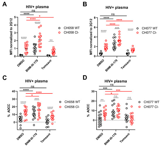 Env cleavage protects HIV-1-infected cells from ADCC mediated by HIV+ plasma. (A,B) Cell surface staining of primary CD4+T cells infected with primary HIV-1 viruses (A) CH058 and (B) CH077 WT or their cleavage-deficient (Cl−) variants using plasma from 15 different HIV-1-infected individuals in the presence of 50 µM of CD4mc BNM-III-170, conformational blocker Temsavir or an equivalent volume of the vehicle (DMSO). The graphs show the MFI obtained on the infected (p24+) cell population. (C,D) Primary CD4+ T cells infected with (C) CH058 and (D) CH077 viruses were also used as target cells, and autologous PBMCs were used as effector cells in a FACS-based ADCC assay. The graphs shown represent the percentages of ADCC mediated by 15 different HIV+ plasma in the presence of 50 µM of CD4mc BNM-III-170, attachment inhibitor Temsavir or an equivalent volume of the vehicle (DMSO). All results were obtained using cells from at least three different donors. Error bars indicate the means ± SEM. Statistical significance was tested using a repeated measures one-way ANOVA with a Holm–Sidak post-test (* p < 0.05; ** p < 0.01; *** p < 0.001; **** p < 0.0001; ns, nonsignificant).
