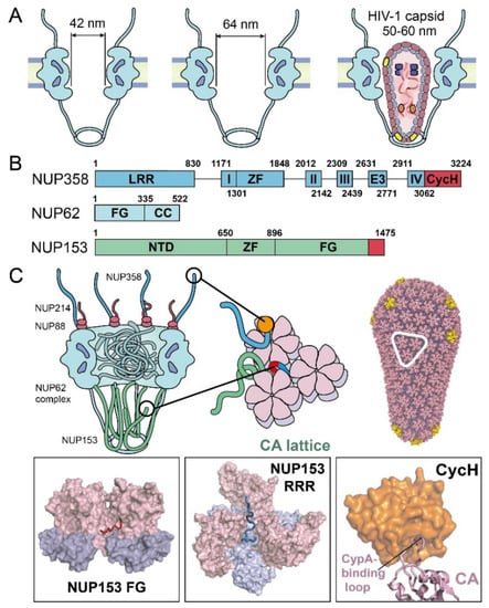 NPC components known to affect nuclear import of the HIV-1 core. (A) Schematics of the diameters of the NPC central channel and the size of HIV-1 capsid. (B) Domain organization of the major capsid-interacting NUPs, including NUP358, NUP153, and NUP62. Known CA-binding fragments are colored in red. Domain labels are as follows: LRR—leucine-rich region; roman numerals I–IV—Ran binding domains I–IV; ZF—zinc finger; E3—E3 ligase domain; CycH—cyclophilin homology domain; FG—phenylalanine-glycine repeats domain; CC—coiled-coil domain; NTD—N-terminal domain. (C) Summary of virus–nucleoporin interactions. The boxed insets show structural details of the interactions. The last FG-motif at NUP153 C-terminal region occupies the FG-binding pocket, formed at the NTD–CTD interface between adjacent CA monomers (PDB 4U0C). NUP153 “RRR” motif at its C-terminus binds at the CA tri-hexamer interface []. NUP358 CycH binds to the CypA-binding loop on CA (PDB 4LQW).