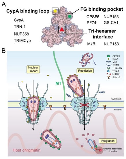 Factors affecting the nuclear import of HIV-1 capsid. (A) Schematic summary of the binding interfaces of HIV-1 capsid with host factors and inhibitors. Selected key interactors are listed. (B) Overview of HIV-1 capsid–host interactions during nuclear entry.
