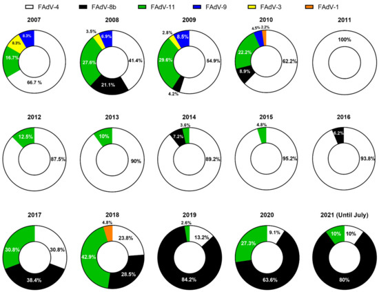 The following are available online at https://www.mdpi.com/article/10.3390/v13112256/s1, Figure S1: Proportion of reported FAdV cases based on each serotype for the periods of 2007–2012 and 2020–2021. Table S1: Number of reported FAdV cases based on each serotype for the periods of 2007–2012 and 2020–2021. Table S2: History of reported FAdV cases based on each serotype for the periods of 2007–2012 and 2020–2021.