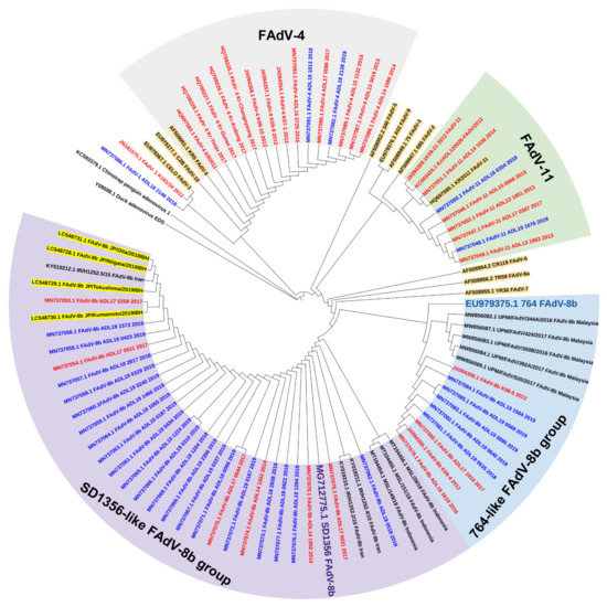 In neighboring Indonesia, FAdV-8b was one of the predominant serotypes [91], and FAdV-8b and -11 were confirmed as emerging causative agents for IBH in Iran [92]. Interestingly, all the Iranian and Indonesian FAdV-8b isolates from these studies were categorized into the SD1356-like FAdV-8b group, as the recent Korean and Japanese strains were, whereas Malaysian 8b isolates were classified as the 764-like FAdV-8b group (Figure 2). Since the Iranian and Indonesian FAdV-8b strains were isolated fairly recently, the possibility of them being recent derivatives or recombinants of the SD1356 strain cannot be ruled out. The rapid distribution of IBH-associated FAdV-8b strains in the past few years is becoming a worldwide phenomenon, including Asian and non-Asian countries [79,84,93,94].