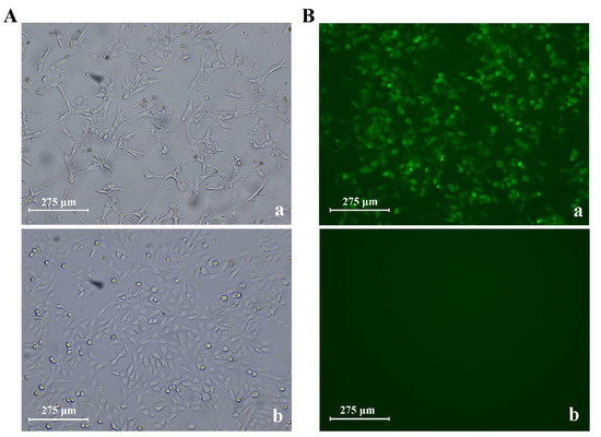 CPV-2 isolation and proliferation. (A) Typical cytopathic morphological changes in CPV-2-infected F81 cells (a in A) compared with the normal F81 control cells (b in A). (B) The immunofluorescence assay of the CPV-2-infected cells (a in B) and the normal F81 control cells (b in B).