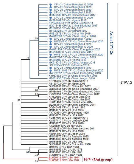 The phylogenetic tree was inferred based on the complete VP2 aa sequences (1755bp, 584 aa) using the maximum likelihood method approaches implemented in MEGA X [23] with 1000 bootstrap replicates, and the cut-off value for the condensed tree was 50%. The Jones–Taylor–Thornton (JTT) model with a discrete gamma (G) distribution obtained the lowest Bayesian information criterion (BIC) scores and was set as the nucleotide substitution model. The 12 CPV-2 full-length VP2 aa sequences obtained in this study were aligned along with those of 48 related strains, including feline panleukopenia virus (FPV) and all subtypes of CPV-2/-2a/-2b/-2c sequences retrieved from GenBank. We re-labeled the names of all VP2 sequences using the GenBank accession number, the variant type of the virus, the country (region), and the year of collection (Supplementary Data S1).
