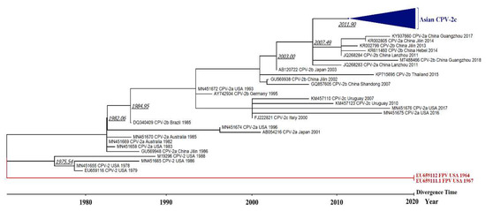 In addition, we calculated the time tree using the RTDT method to investigate the divergence time of the CPV-2 variants. The results reveal that CPV-2 diverged from FPV around the 1970s, and the new “Asian CPV-2c” clade was differentiated between 2011 and 2013 (Figure 4).