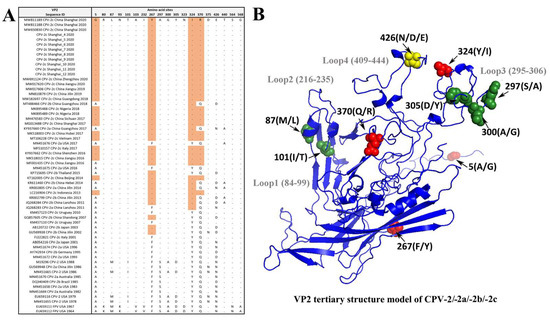 The VP2 variants and structure between the FPV and CPV-2/-2a/-2b/-2c variants. (A) The variants and amino acid variation sites in the VP2 gene. (B) A VP2 tertiary model of the variants. Amino acids are represented by single-letter abbreviations. The site at position 426 (yellow color), located at the top of the protrusion region of the loop 4 structure [27], is the signature site that distinguishes CPV-2a (Asn), -2b (Asp), and -2c (Glu). The five specific sites at 87Met, 101Ile, 297Ser, 300Ala, and 305Asp for CPV-2 variants were labeled with green color in B. The characteristic mutations of 5Gly, 267Tyr, 324Ile, and 370Arg in the new Asian CPV-2c variant are marked with red color in (B).