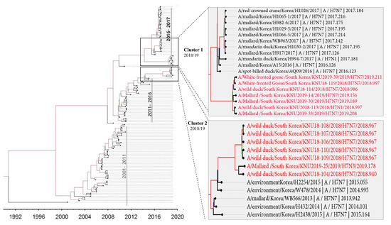From our analysis, it is predicted that in 2018–2019, two different subgroups of H7 viruses might have been introduced into the Republic of Korea via different migratory bird populations through fecal contamination. The locations of circumpolar arctic and subarctic breeding grounds of migrating birds flying over numerous flyways in Eurasia overlap, with some sharing common breeding areas [37]. Thus, surveillance and monitoring of H7 subtype AIVs in wild birds are essential for avoiding large-scale morbidities.