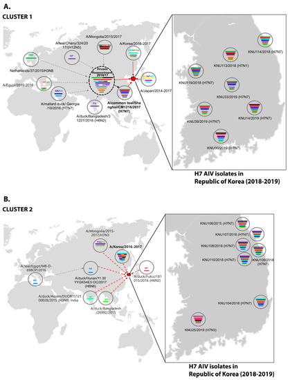 Original reassortment events of the novel avian influenza H7 isolates isolated during 2018–2019 in the Republic of Korea. (A) Cluster 1 represents possible reassortment events associated with KNU106/2018, KNU107/2018, KNU108/2018, KNU110/2018, KNU109/2018, KNU104/2018, and KNU25/2019. (B) Cluster 2 involves possible reassortment events associated with most of our isolates from 2019 and a few from 2018, such as KNU114, KNU113, and KNU119.