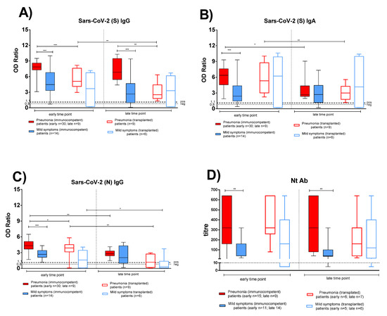 Several studies reported that IgG antibodies persist longer in immunocompetent patients with severe SARS-CoV-2 infection compared to milder cases [4,5]. According to some studies, the IgG and IgA titres were higher in patients with severe symptoms [5,6,7]. Conversely, a study reported no difference between mild and severe immunocompetent patients [8]. Higher titres of neutralizing antibodies (Nt Ab) were detected in the most clinically severe cases [9,10,11,12,13,14], while no neutralizing activity was detected in plasma from the majority of asymptomatic cases [12].