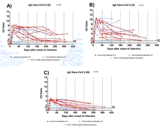 Antibody response kinetics in transplanted patients with pneumonia or mild symptoms. (A) Anti-Spike (S) IgG; (B) anti-Spike (S) IgA; (C) anti-Nucleocapsid (N) IgG. Red lines represent pneumonia patients; light blue lines represent patients with mild symptoms. Light blue lines with white circles represent patients with gastrointestinal symptoms.