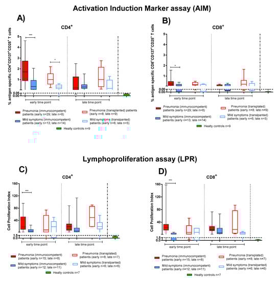 SARS-CoV-2-specific T-cell responses were compared between immunocompetent (IC) and transplanted (TX) patients with pneumonia or mild symptoms at early and late time points. (A) SARS-CoV-2-specific CD4+ and (B) CD8+ T-cells (rapid Activation Induced Marker assay); (C) CD4+ T-Cell Proliferation Index; (D) CD8+ T-Cell Proliferation Index. Early time point: patients with pneumonia, IC median 58 (range 45–100); TX 60 (30–62) days after infection; patients with mild symptoms, IC 48 (30–100); TX 54 (26–75) days after infection. Late time point: patients with pneumonia, IC median 212 (range 186–400); TX 233 (164–309) days after infection; patients with mild symptoms, IC 192 (150–306); TX 167 (150–207) days after infection. * p < 0.05; *** p < 0.001.