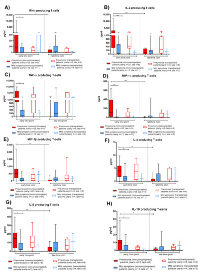 Cytokine production of T-cells after stimulation with Spike (S) peptide pools in immunocompetent and transplanted patients with pneumonia or mild symptoms at early and late time points. (A) IFN-γ. (B) IL-2. (C) TNF-α. (D) MIP-1α. (E) MIP-1β. (F) IL-4. (G) IL-5. (H) IL-10. Early time point: patients with pneumonia, median 59 (range 30–100) days after infection; patients with mild symptoms, 52 (26–100) days after infection. Late time point: patients with pneumonia, median 220 (range 164–400); days after infection; patients with mild symptoms, 189 (150–306) days after infection. * p < 0.05; ** p < 0.01; *** p < 0.001.