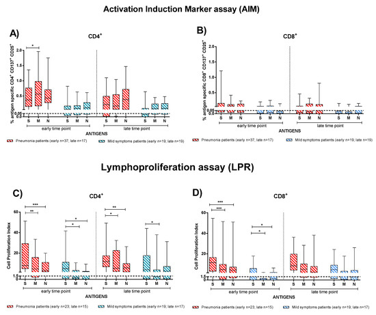 The T-cell dominant specificity after stimulation with Spike (S), Membrane (M), and Nucleocapsid (N) peptide pools in patients with pneumonia or mild symptoms at early and late time points (immunocompetent and transplanted were considered together). (A) Antigen-specific CD4+ T-cells and (B) CD8+ T-cells (rapid Activation Induced Marker assay); (C) CD4+ T-Cell Proliferation Index; (D) CD8+ T-Cell Proliferation Index. Early time point: patients with pneumonia, median 59 (range 30–100) days after infection; patients with mild symptoms, 52 (26–100) days after infection. Late time point: patients with pneumonia, median 220 (range 164–400); days after infection; patients with mild symptoms, 189 (150–306) days after infection. * p < 0.05; ** p < 0.01; *** p < 0.001.