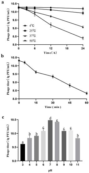 2.6. Stability of the Phage under Various Thermal, Ultraviolet, and pH Conditions