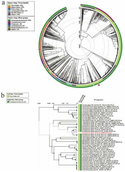 - Nishimura, Y.; Yoshida, T.; Kuronishi, M.; Uehara, H.; Ogata, H.; Goto, S. ViPTree: The Viral Proteomic Tree Server. Bioinformatics 2017, 33, 2379–2380. [Google Scholar] [CrossRef]