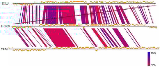 - Sullivan, M.J.; Petty, N.K.; Beatson, S.A. Easyfig: A Genome Comparison Visualizer. Bioinformatics 2011, 27, 1009–1010. [Google Scholar] [CrossRef]