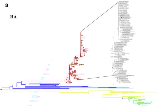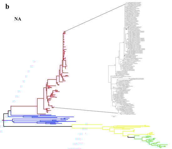 Phylogenetic tree of HA and NA sequences of H3N2: (a) phylogenetic tree of HA sequences of H3N2. (b) Phylogenetic tree of NA sequences of H3N2. Red, blue, yellow, and green branches represent isolates from dogs, avian, swine, and humans, respectively. Black circles represent the strains in this study.