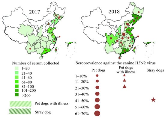 Prevalence rates of H3N2 CIVs in dogs across China in 2017–2018. (a) Prevalence rates of H3N2 CIVs in dogs across China in 2017. (b) Prevalence rates of H3N2 CIVs in dogs across China in 2018. Provinces with sampling points are marked green, and the sampling quantity is reflected by the color depth. Red dots, samples from pet dogs; red triangle and stars, samples from pet dogs with illness and stray dogs, respectively. The symbol size was used to describe the size of seroprevalence.