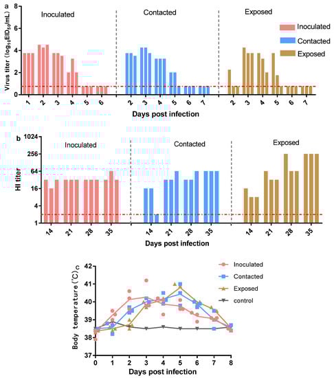 Transmission of canine H3N2 CIVs in beagles. (a) The vertical axis represents the titers of influenza viruses recovered from nasal washes of virus-inoculated, contacted, and exposed dogs. The dashed line represents the limit of detection. (b) HI antibody titers of the tested animals. Each column represents an individual animal. The dashed line represents the limit of detection. (c) Changes in body temperature after canine H3N2 infection.