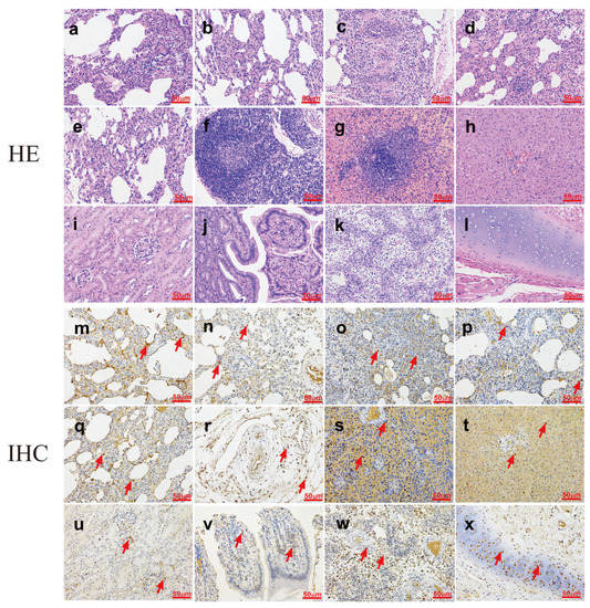 Histopathological analysis of dogs. Dogs were killed on 3 dpi with 107 EID50 of the test virus. H&E staining images (a–l). (a–e) Lungs from H3N2 virus-infected dogs, with collapsed alveolar septum and alveolar cavity expansion and some lymphocyte infiltration of the stroma. (f) Hilar lymph nodes in dogs infected with H3N2 virus manifested as lymphoid tissue hyperplasia. (g) The liver of dogs infected with the H3N2 virus shows mild edema of hepatocytes. Spleen (h), kidney (i), and duodenum (j) are normal. (k) The mesenteric lymph node tissues of H3N2 virus-inoculated animals show mild histopathological changes. (l) Sloughing in the trachea. IHC for nucleoprotein (NP) detection in sections of intranasally infected dogs. Images from (m) to (x) after IHC: (m–q) a high viral antigen titer was detected in the lung tissues. Hilar lymph nodes (r), liver (s), spleen (t), kidney (u), duodenum (v), mesenteric lymph nodes (w), and trachea (x) showed only a mild presence of viral antigen. Red arrow, viral antigen positivity. Scale bars in (a–x), 50 μm.