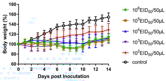 A total of 30 BALB/c mice (16–18 g, female) were purchased from the Beijing Vital River Laboratory (Beijing, China) and randomly divided into six groups. The virus solution was diluted to a range of 102–106 EID50/50 μL. All mice were lightly anesthetized with isoflurane and inoculated intranasally (i.n.) with the diluted virus solutions in a volume of 50 μL, and the control group was inoculated with an equivalent volume of phosphate-buffered saline (PBS). At 3 dpi, three mice in the 106 EID50 group were sacrificed, and organs (brain, intestine, spleen, kidney, brain, nasal turbinate, and lung) were collected for viral RNA load analysis. The animal body weight was monitored daily until 14 dpi.