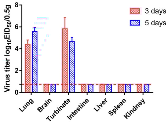 Tissue tropism of the new clade (represented by qk01/2017) CIV. Mice (n = 3) were infected with 106 EID50 of the qk01/2017 isolate. Lung, nasal turbinate, brain, liver, spleen, kidney, and intestine samples were collected, and viral titers were determined at 3 and 5 dpi. The dotted line indicates the detection limit.