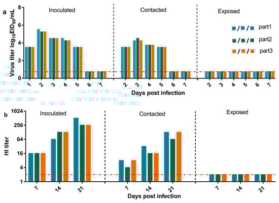 Replication and transmission in guinea pigs of H3N2 CIVs. (a) The vertical axis represents the titers of influenza viruses recovered from nasal washes in virus-inoculated, contacted, and exposed guinea pigs. (b) HI antibody titers of the animals. Each color bar represents an individual animal. The dashed line represents the limit of detection.