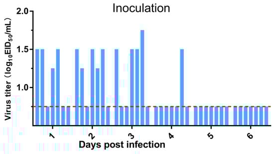 Replication in chickens of H3N2 CIVs. Viral titers in throat and cloacal swabs mixed samples after infection with H3N2 CIVs. A group of seven chickens was inoculated with 3 × 106 EID50/0.1 mL of the test virus. Each blue bar represents the virus titer in an individual animal. The dashed red line indicates the lower limit of detection.