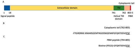 ACE2 is a glycosylated integral membrane protein of 805 residues with a large N-terminal ectodomain (residues 18–740), a transmembrane domain of 21 residues (residues 741–761) and a short cytoplasmic C-terminal region (residues 762–805) containing a PDZ (PSD-95/Dlg/ZO-1)-binding motif (PBM) at the C-terminal extremity (residues 803–805; sequence-TSFCOOH) [] (Figure 1A). This PBM of class I with the motif sequence (S/T)-X-ΦCOOH, where X is any residue (position −1), and Φ is a hydrophobic residue (last position 0) (Figure 1B), is enabled to bind to other proteins through their PDZ domains. The affinities of a FITC-labeled C-terminal peptide of ACE2 796–805 were previously measured for eight PDZ domains by fluorescence polarization assays []. Three PDZ domains, the first PDZ domain (PDZ1) of NHERF3 and the PDZ domains of SHANK1 and SNX27, were found to bind to the ACE2 PBM peptide. However, only 8 of 272 PDZ expressed in the human proteome (the PDZome) were tested in this study. Recently, ACE2 was also shown to interact with NHERF1 PDZ domains enhancing the ACE2 membrane residence, and consequently increasing the ACE2-mediated SARS-CoV2 cell entry [].
