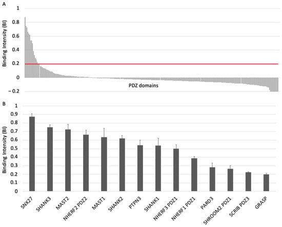 Binding intensity (BI) values were calculated using the formula: BI = (Itot − Idepl)/Itot, where Itot is the total peak intensity of PDZ (biotin control) and Idepl is the intensity of the PDZ peak in the presence of the peptide. BI = 0.2 was used as the minimum BI cutoff value to define high confidence PDZ–PBM pairs, as previously proposed []. For detailed protocols, see references [,].