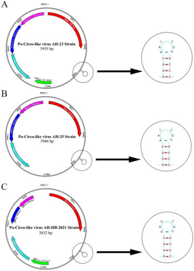 Predicted genomic structural characteristics of PCLV-AH-23, PCLV-AH-25 and PCLV-AH-HB-2021. PCLV-AH-25 only four potential ORFs were present, whereas in strain PCLV-AH-23 and PCLV-AH-HB-2021, the locations of five potential ORFs were identified,, one of which contained the opposite transcriptional direction. A significant T7G mutation was found in the stem loop of PCLV-AH-HB-2021.