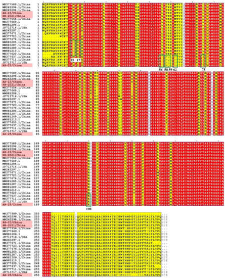 The reference strains were sourced from the NCBI database, as shown in Table S3. Sequence identity was analyzed using Megalign (DNASTAR, Madison, WI, USA). Sequence alignment was performed based on nucleotide sequences via MAFFT (https://mafft.cbrc.jp/alignment/software/, accessed on 29 August 2021) and ESPript Software (https://espript.ibcp.fr/ESPript/ESPript/; accessed on 2 September 2021). Phylogenetic analysis was performed using PhyloSuite software [15]. Maximum likelihood phylogenies were inferred using IQ-TREE for 5000 ultrafast bootstraps and the Shimodaira–Hasegawa-like approximate likelihood-ratio test [16,17]. ModelFinder was used to select the best substitution model [18]. Phylogenetic trees were visualized using FigTree software.