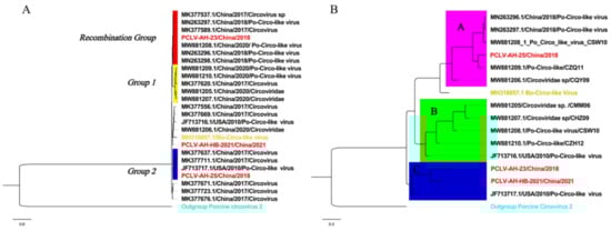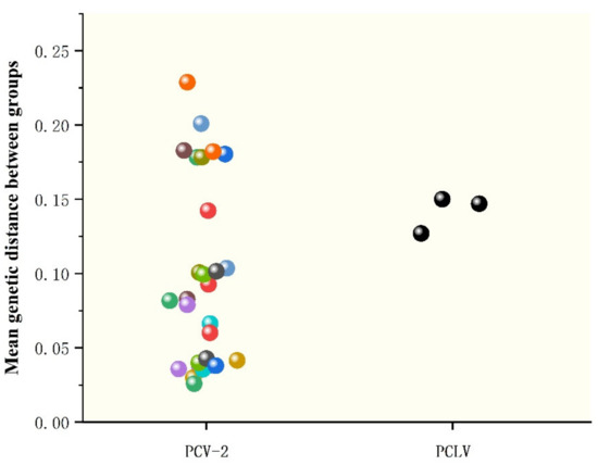 Phylogenetic analysis based on complete sequences showed that all strains were divided into three groups, tentatively named Groups A, B and C. Among them, strains AH-23 and AH-HB-2021 were in a branch with the Po-Circo-like virus 22 strain found in the United States in 2010, while AH-25 was closer to the Po-Circo-like virus isolate CZQ11 isolated in China (Figure 4B). We compared the average between-group genetic distance for each genotype of PCV-2, and the results showed that the genetic distance between the three groups of PCLV was similar to that between PCV-2 types 2e and 2d, less than for 2a–2b, 2a–2c, 2a–2d, 2a-2e, 2a-2f and 2a-2g, and larger than that between other genotypes (Figure 5).