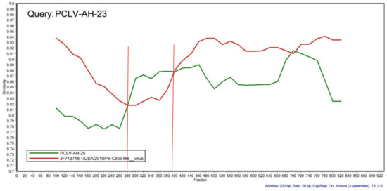 Recombination analysis of PCLV. PCLV-AH-23 was the query sequence, and the major and minor parents were strain PCLV-AH-25 (accession number: MZ773068/China) and Po-Circo-like virus 21 (accession number: JF713716.1/USA). The red curve represents the similarity of strain Po-Circo-like virus 21 to strain PCLV-AH-23. The green curve represents the similarity of strain PCLV-AH-25 to strain PCLV-AH-23. Rep is the potential recombination region. Recombination events were identified using seven methods in the Recombination Detection Program v.4.39 (RDP 4.39), namely, RDP, GENECONV, Chimaera, MaxChi, BootScan, SiScan and 3Seq. The SimPlot software v.3.5.1 was used for the analysis with visual similarity plots using a window size of 200 nucleotides that was moved along in 20 nt steps.
