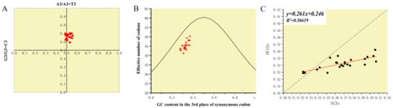 Analysis of factors mediating codon usage bias. (A) Parity Rule 2 (PR2) plot was used to analyze whether the effects of mutation pressure and natural selection on the use of the Rep codon were consistent. Figure 8A shows that mutation pressure and natural selection have unequal effects on the use of codons during evolution. (B) The ENC-GC3s plot was analyzed, with the ENC values plotted against the GC3S values to determine the main factors affecting codon use bias. The expected ENC values for each GC3S were estimated. Figure 8B shows that main factor affecting codon use bias was selection pressure. (C) Neutrality analysis was used to evaluate the effects of mutation pressure and natural selection on codon usage patterns. Figure 8C shows that the fitting curve (red line) deviates from the curve y = x (black line), indicating that selection pressure plays a dominant role, which is consistent with Figure 8B.