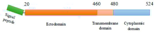 The G protein is a type I glycosylated protein, composed of 524 amino acids. During G protein maturation, the signal peptide is removed, and the mature G protein contains 505 amino acids [49]. A mature G protein can be divided into three parts (Figure 2): the extracellular domain; the transmembrane domain; and the cytoplasmic domain. The extracellular domain exists in the form of a homotrimer, each monomer containing 439 amino acid residues. The transmembrane domain comprises around 20 amino acid residues (aa 460 to aa 480). The cytoplasmic domain encompasses 44 amino acids in the inner membrane that extends into the cytoplasm of infected cells and interacts with M proteins to complete viral assembly [5,50].