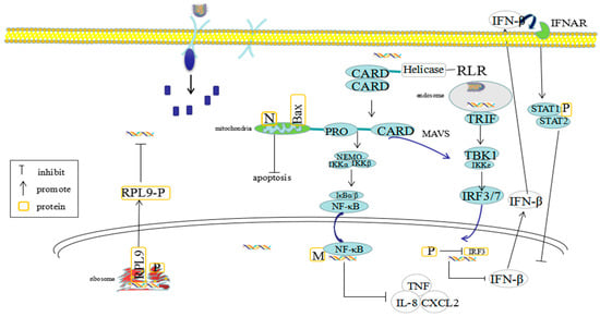 Figure 3. Schematic representation showing the interaction between rabies virus (RABV) viral proteins and host proteins in the innate immune system. N protein and activated Bax protein (a member of Bcl-2 family) co-located in the mitochondria of infected cells, and prevented the activation of Bax. In the early stage of infection, N protein effectively inhibited the apoptosis of mitochondria, prevented caspase-dependent and caspase-independent apoptosis, and provided time for virus replication and transcription. However, the expression of N protein had no effect on the expression level of Bcl-2 family members P protein plays the role of type I interferon (IFN) antagonist by reducing the phosphorylation of IFN regulatory factor-3 (IRF-3), inhibiting IFN production and blocking JAK/STAT signal transduction mediated by IFN. It plays an important role in virus escape from host innate immunity. P protein can bind to RPL9 protein directly in vivo and abroad, and transfer RPL9 protein from nucleus to cytoplasm, thus inhibiting the initial stage of RABV transcription. In the late stage of infection, M protein partially acts on mitochondria through caspase-dependent and caspase-independent pathways to induce mitochondrial apoptosis and promote virus replication and transmission. The interaction of M protein with C-terminal specific region of RelAP43, one of six members of NF-κB family, can inhibit NF-κB signaling and IFN- β transcription, which provides a way to avoid antiviral natural immunity. G protein can bind to cell receptor and mediate the invasion of virus to host, so G protein is closely related to the pathogenicity of virus.