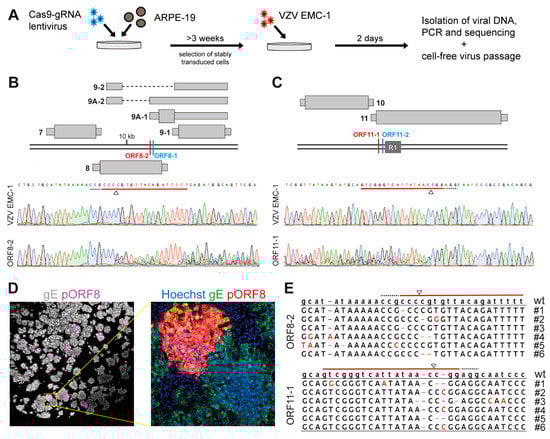 Editing of varicella-zoster virus (VZV) genomes using CRISPR/Cas9. (A) Experimental layout: ARPE-19 cells were transduced with a lentivirus encoding for both SpCas9 and a sgRNA, and selected for at least 3 weeks with appropriate antibiotics. Stably transduced cells were infected with cell-free VZV EMC-1 for two days, viral DNA was isolated and the target region was amplified by PCR and sequenced. (B,C) Top: Schematic illustration of the target region of ORF8 (B) and ORF11 (C): thick double black lines represent the VZV genome, currently annotated RNAs are depicted in grey—wide boxes are coding sequences (CDS), thin boxes are untranslated regions (UTRs) and dashed lines are intronic sequences—and DNA target sites of sgRNAs ORF8-1 and ORF8-2 (B) or sgRNAs ORF11-1 and ORF11-2 (C) are depicted. Bottom: Sanger sequencing traces showing the sgRNA target regions (red), PAM sequence (dashed black) and cleavage site with triangle for wild-type VZV EMC-1 DNA or from DNA extracted from VZV EMC-1 infected stably transduced ORF8-2 (B) and ORF11-1 cells (C). (D) Representative images of infected ARPE-19 cells with cell-free virus isolated from infected ORF8-2 cells stained by immunofluorescence for glycoprotein E (gray/green) and pORF8 (magenta/red). Nuclei were counterstained with Hoechst 33342 (blue), with 20× magnification (left) or 200× magnification (right). (E) Consensus Sanger sequences of 6 individual infectious foci after a single round of cell-free virus isolation and plaque purification following infection of stably transduced ORF8-2 (top) and ORF11-1 (bottom) cells. sgRNA target regions (red line), PAM sequence (dashed black line) and cleavage site with triangle are depicted.