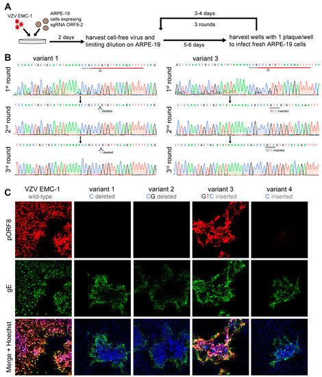 Plaque purification of VZV edited by gRNA ORF8-2. (A) Experimental design: Stably transduced ARPE-19 cells expressing sgRNA ORF8-2 were infected with VZV EMC-1. Two days post-infection, cell-free virus was harvested, and subjected to three subsequent rounds of plaque purification. (B) Sanger sequencing after each round of plaque purification for variant 1 and 3 showing the sgRNA target regions (red), PAM sequence (dashed black), cleavage site with triangle and identified mutation. (C) Representative images of ARPE-19 cells infected with VZV EMC-1 or 4 ORF8 variant viruses derived from sgRNA ORF8-2 cells by plaque purifications stained by immunofluorescence for glycoprotein E (green) and pORF8 (red). Nuclei were counterstained with Hoechst 33342 (blue), with 10× magnification.