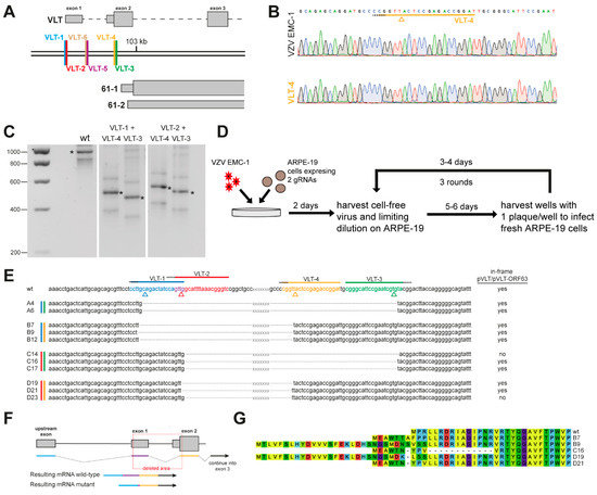 Generation of VZV latency-associated transcript (VLT) mutant viruses using combinations of two different sgRNAs. (A) Schematic illustration of the VLT target region: thick double black lines represent the VZV genome, annotated RNAs are depicted in grey—wide boxes are coding sequences (CDS), thin boxes are untranslated regions (UTRs) and dashed lines are intronic sequences—and the DNA target sites of sgRNAs VLT-1 to VLT-6 are depicted in differentially colored lines. (B) Sanger sequencing traces showing the sgRNA target region (yellow), PAM sequence (dashed black) and cleavage site (colored triangle) for wild-type VZV EMC-1 DNA (top) and DNA extracted from VZV EMC-1 infected stably transduced VLT-4 cells (bottom). (C) PCR products from VLT upstream exon C to VLT exon 2 on DNA isolated from parental ARPE-19 cells or from cells stably transduced with a combination of sgRNAs as indicated 2 days post-infection with VZV EMC-1. Correct band is indicated by an asterisk, additional bands result from duplication of primer binding site in R5. (D) Experimental design: Stably transduced ARPE-19 cells expressing two sgRNAs targeting the VLT region were infected with VZV EMC-1. Two days post-infection, cell-free virus was harvested, and subjected to three subsequent rounds of plaque purification. (E) VZV DNA sequence around sgRNA target sites of isolated plaque purified viruses divided into 4 groups: A—combination of sgRNA VLT-1 and sgRNA VLT-3, B—combination of sgRNA VLT-1 and sgRNA VLT-4, C—combination of sgRNA VLT-2 and VLT-3, D—combination of sgRNA VLT-2 and VLT-4. Dashed lines represent deleted nucleotides, whereas ‘xxx’ signifies the region in between the sgRNAs target sequences deleted in all mutants. PAM sequences (dashed black) and expected cleavage sites (colored triangles) are indicated. (F) Schematic illustration of VLT transcript generation from wild-type or mutant viruses from any upstream VLT exon (blue line), into exon 1 (purple line), exon 2 (orange line) and the remainder of VLT (black arrow). (G) Alignment of proteins generated in mutant viruses by in-frame splicing of an upstream ATG with the remainder of pVLT/pVLT-ORF63. Amino acids are colored to aid visual comparison.