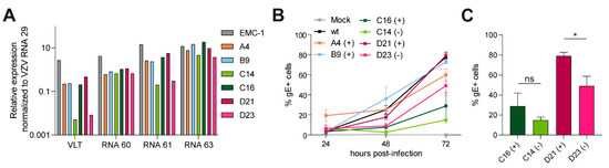 Subsequently, we compared viral growth of these VLT mutant isolates and VZV EMC-1 in ARPE-19 cells by flow cytometry. We observed substantial variability between biological replicates, which was independent of the virus used and most likely caused by the high particle to PFU ratio inherent to cell-free VZV stocks [33,34]. Although none of the mutant virus isolates significantly differed from VZV-EMC-1 (Figure 4B), the two pVLT/pVLT-ORF63(-) mutants (C14 and D23) appeared to be impaired in replication compared to pVLT/pVLT-ORF63(+) counterparts from the same group (C16 and D21 respectively) (Figure 4C). However, since these mutant viruses contain relatively large deletions in the VLT region that also affect expression of VLT, RNA 60, and RNA 61, we cannot exclude the possibility that the observed phenotype is partially unrelated to the absence of pVLT/pVLT-ORF63.