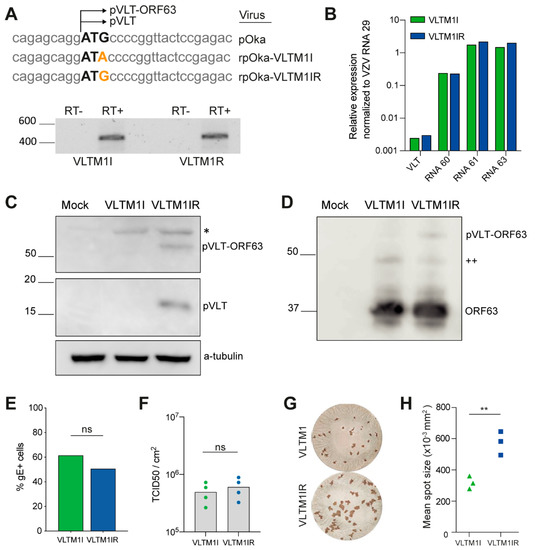 Generation of VZV pVLT/pVLT-ORF63 mutant viruses using BAC mutagenesis. (A) Top: Nucleotide sequence of VZV pOka, rpOka-VLTM1I and rpOka-VLTM1IR of the pVLT/pVLT-ORF63 ATG start codon in black, mutations in orange and its flanking regions and bottom: RT-PCR on RNA isolated from ARPE-19 cells infected with VZV VLTM1I or VLTM1IR using primers located in VLT exon 1 and exon 5. RT-/RT+: reverse transcriptase omitted or added in cDNA synthesis. (B) Relative expression level of VLT RNAs, RNA 60, RNA 61 and RNA 63 in ARPE-19 cells asynchronously infected with VLTM1I or VLTM1IR. Expression levels were normalized to VZV RNA29 to compensate for differences in infection. (C,D) Western blots on lysates of mock-, VZV VLTM1I- or VZV VLTM1IR-infected ARPE-19 cells stained with anti-pVLT, anti-alpha-tubulin (C) and anti-pORF63 (D) antibodies. Bands for pVLT and pVLT-ORF63 are indicated, * signifies an nonspecific band detected in all virus-infected cells, ++ indicates pORF63-N+ [10]. (E) Percentage VZV glycoprotein E (gE)–positive cells by flow cytometry of VZV VLTM1I and VLTM1IR in ARPE-19 cells at 72 hpi. Representative data for n = 2 independent experiments, n = 3 technical replicates. ns, not significant by unpaired Student’s t-test. (F) Cell-associated VZV titers of monolayers infected with VLTM1I or VLTM1IR virus at 72 hpi as measured by TCID50 per cm2, ns: not significant by unpaired Student’s t-test. (G,H) Infectious focus assay of VZV VLTM1I and VLTM1IR-infected ARPE-19 cells at 6 days post-infection (n = 2 independent experiments, 4 replicates each). (G) Representative images of infected wells stained for VZV gE by immunohistochemistry and (H) Mean spot size (×103 mm2) of VLTM1I (green) and VLTM1IR (blue) viruses per well, ** p < 0.01 by unpaired Student’s t-test.