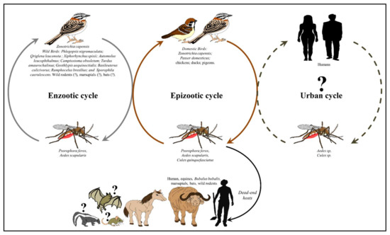 To date the transmission cycle of ROCV is not well understood. Based on surveillance and experimental studies it is likely that ROCV is maintained in nature in a mosquito–bird–mosquito transmission cycle, where humans are incidental dead-end hosts [8,16] (Figure 2). Comprehensive entomological surveillance during the outbreak of 1975–1976, implicated Ps. ferox as a transmission vector with the isolation of ROCV [8]. Interestingly in the study of Lopes et al [8], two of the Ps. ferox mosquitoes were engorged with canine blood. Ps. ferox is a floodwater mosquito species native to most of North and South America, typically found in woodland environments with pools that intermittently fill with rain or flood water [22,23]. It is a strong flyer with a long dispersal range, as far as 11 km from the point of release [24]. It is a competent virus of transmission for several arboviruses, including St. Louis encephalitis [25], Una [26], Ilheus [26] and Venezuelan equine encephalitis [27] and exhibits opportunistic feeding behavior, although mammalian blood sources are preferable to avian [28,29]. Coupled with the mosquito’s aggressive feeding behavior, this highlights its potential threat for public health.