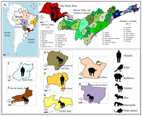 Overview of detected circulation of the Rocio virus in Brazil. (A). Brazilian states where detection of ROCV was documented. (A1) São Paulo State. During the outbreak of the 1970s, ROCV circulation was detected in 8 regions in the Santista Lowlands and 23 regions in the Ribeira valley. Serology showed flavivirus exposure in rodents, bats, marsupials, and pigeons; (A2) Goiás State; (A3) Rio de Janeiro State. Serologic detection in equines; (A4). Mato Grosso do Sul State. Serologic detection in equines; (A5) Serologic detection in humans; (A6) Paraíba State. Serologic detection in equines. (A7) Pará State. Serologic detection in buffaloes (Bubalus bubalis). (A8) Mato Grosso State. Serologic detection in equines.