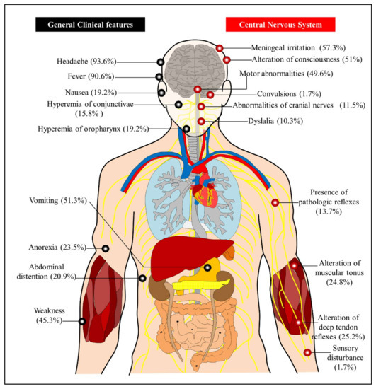 Clinical manifestations of infection include fever, malaise, severe headache, lower-extremity weakness, and severe neurologic disorders, with permanent sequelae observed in 20% of surviving patients [2,7,9,15,61]. The clinical features of ROCV infection are depicted in Figure 4. The incubation period lasts 7 to 14 days, with patients presenting with abrupt onset of fever, severe headache, anorexia, nausea, vomiting, myalgia, and malaise, and in severe cases stupor and coma with respiratory complications [3]. Late signs of encephalitis included confusion, reflex disorders, motor impairment, meningeal irritation, cerebellar syndrome, and seizures. Neuropsychiatric sequelae were observed in 20% of the patients: visual, olfactory, and hearing disorders, lack of motor coordination, disturbance of balance, difficulty in swallowing, urinary incontinence and memory defects [3]. ROCV infections were lethal in 10% of cases. Autopsies of fatal encephalitis cases showed histopathological lesions in the brain and signs of thalamic inflammation [61].