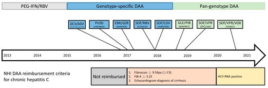 In Taiwan, the estimated prevalence of HCV is 3.28% (1.8–5.5%) in the general population, and even more than 10% in some hyperendemic areas [,]. To effectively control and treat chronic hepatitis C, the Taiwan National Health Insurance Bureau started interferon and ribavirin combination therapy in 2004, but phased into reimbursing DAAs in year 2017. As in other countries, the DAA reimbursement in Taiwan began with priority patients, only for those who failed previous interferon and ribavirin therapy and with fibrosis stage above F3. Later in 2017, DAAs were reimbursed for patients whose fibrosis stage was above F3, regardless of treatment experience. In September 2019, DAAs were reimbursed for all chronic hepatitis C patients. The introduction of different DAAs also evolved in the past several years. Since January 2017, the earliest available DAAs were daclatasvir/asunaprevir and dasabuvir plus ombitasvir/paritaprevir/ritonavir. Then in August 2017, elbasvir/grazoprevir was introduced. In 2018, sofosbuvir and sofosbuvir/ledipasvir were added. Then glecaprevir/pibrentasvir was included later. Since June 2019, sofosbuvir/velpatasvir was reimbursed. Genotype-specific DAA era transitioned into pangenotype-DAA era after August 2018 in Taiwan (Figure 1). In order to learn the effectiveness and barriers for DAA therapies, Taiwan Association for the Study of the Liver (TASL) established a Taiwan HCV Registry (TACR) in July 2020 to recruit DAA-experienced subjects and their clinical histories. Till year 2021, a total of 13951 patients from 48 study sites participated in the program and provided useful clinical profiles about DAA therapy in Taiwan [].
