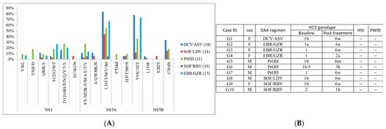 - Itakura, J.; Kurosaki, M.; Kakizaki, S.; Amano, K.; Nakayama, N.; Inoue, J.; Izumi, N. Features of resistance-associated substitutions after failure of multiple direct-acting antiviral regimens for hepatitis C. JHEP Rep. 2020, 2, 100138. [Google Scholar] [CrossRef] [PubMed]