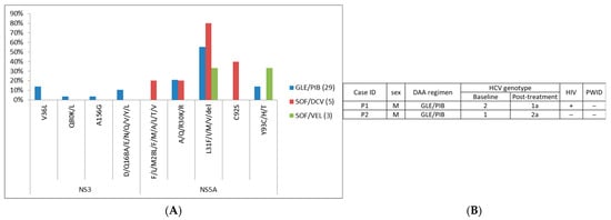 Among these DAA regimens, glecaprevir/pibrentasvir and sofosbuvir/velpatasvir are currently the principal regimens, whereas many regimens are no longer available or rarely used. Therefore, we specifically focus on the RASs on glecaprevir/pibrentasvir and sofosbuvir/velpatasvir. In our study, four patients took sofosbuvir/velpatasvir and thirty-one took glecaprevir/pibrentasvir.